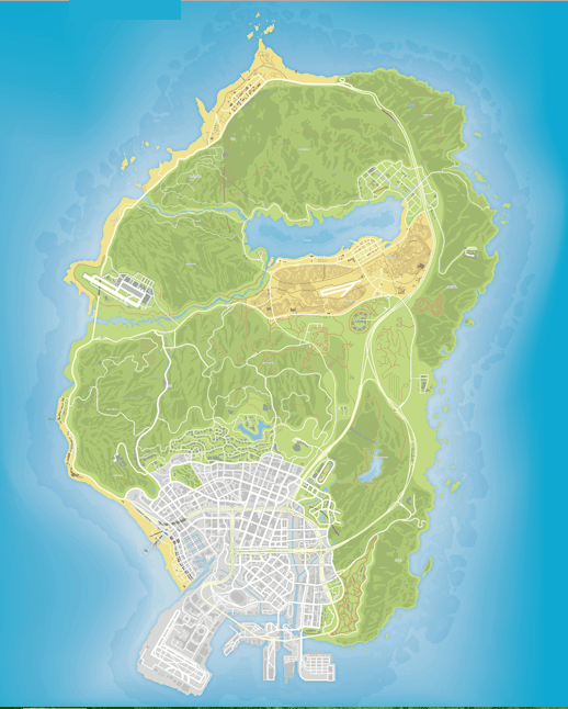 La metropoli di Los Santos si trova all’estremo sud dello stato, separata dal deserto del Grand Senora dalle colline di Vinewood , dove si trova il famoso segno di Vinewood. Il mare di Alamo , un lago salato basato sulla vita reale del Salton Sea, insieme al deserto di cui sopra e alle città di Sandy Shores e Grapeseed si trova in un ampio bacino circondato dal massiccio Monte Chiliad , il punto più alto dello stato, a nord , Monte Giosia a ovest, la catena montuosa di San Chianskie il monte Gordo a est e le colline di Vinewood a sud. Al di là del Monte Chiliad, la città di Paleto Bay e la foresta circostante è collegata al resto dello stato dalla Great Ocean Highway , dal Mount Chiliad Tunnel e dal Braddock Pass tra il Monte Chiliad e il Monte Gordo. La base dell’esercito americano di Fort Zancudo si trova ai piedi del monte Josiah, accanto al fiume Zancudo, uno dei due sbocchi naturali del mare di Alamo, l’altro è Cassidy Creek , che attraversa il Raton Canyon. Spiagge naturali delimitano l’ovest dell’isola, che si estende dal quartiere Los Santos di Vespucci a Paleto Bay, mentre la costa orientale ha alte scogliere e montagne.